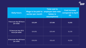 The cost impact of the NMW increases will depend on the exact worker fact pattern, but below we have summarised illustrative examples for two main scenarios. Note that several assumptions have been applied, and the true costs may differ for your business. A list of our assumptions and caveats is outlined at the bottom of this blog.