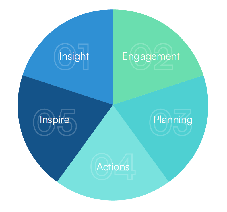 Engaging with Operational Leads to pilot ideas, and presenting to the Executive Team so they champion the strategy. From grass-roots to C-Suite, from employees to investors – we map and address stakeholder